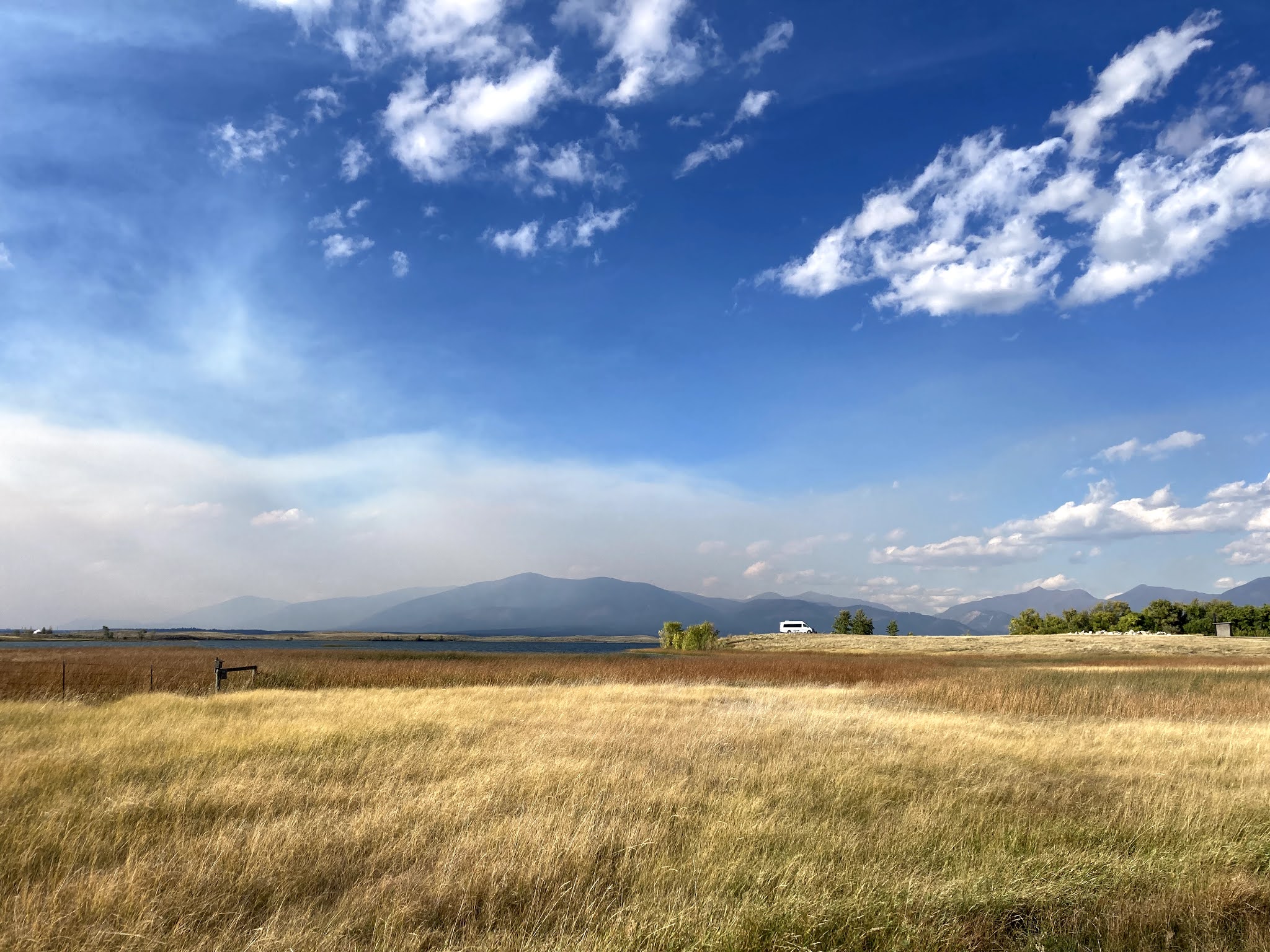 Hauled into Les Schwab in Missoula to see if one of the guys there thought the oil on the dipstick looked rather too dark; the guy said it looked pretty dark but he had seen darker and they couldn’t get to it for several hours so we drove on and eventually arrived Brown’s Lake some kind of state fishing access point with camp privileges. Lots of older dudes with trailers and pickups and small boats scattered about a little rise half surrounded by Brown’s Lake. We joined them. Very chilly with a sharp wind and now smoke has rolled in from the west. Cozy as heck in the CS Adventurous LX.